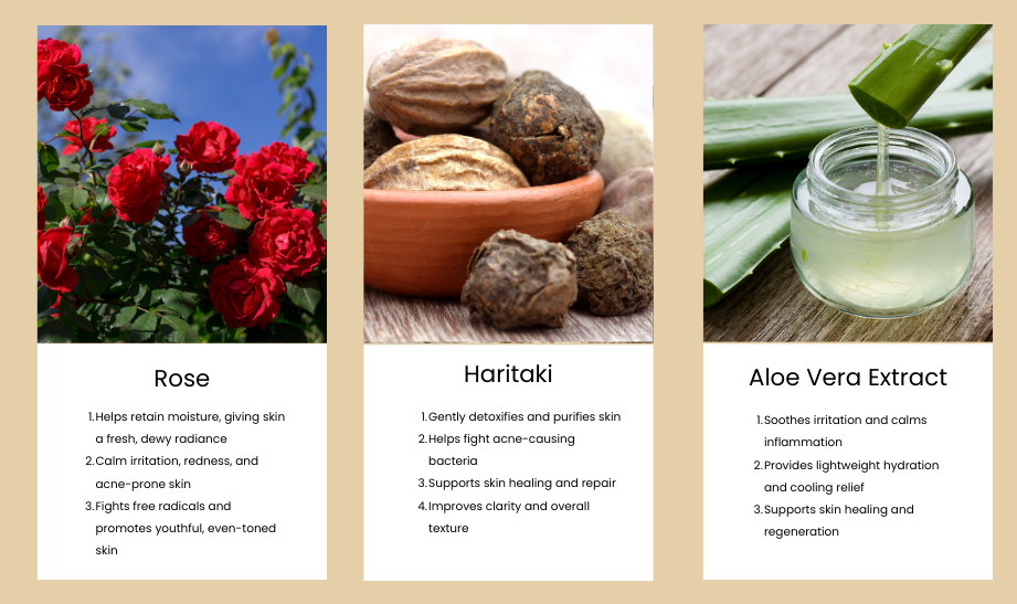 Powered by 100% flower extracts and a gentle, free, paraben free, and dye free formula, it effectively removes impurities while staying kind to your skin. Aloe Vera, rose water, and haritaki work together to cleanse deeply, penetrate the skin’s layers, and support natural elasticity and radiance.