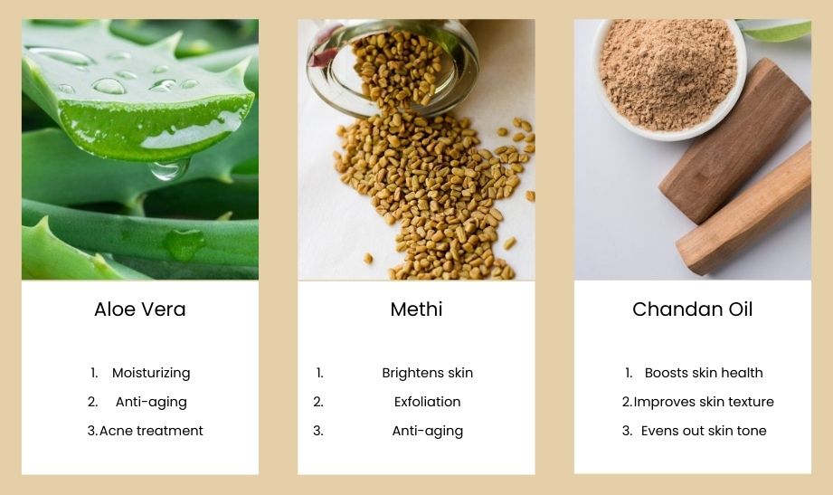 Aloe Vera, Rose, Mulethi, Manjist, Methi, Haritaki, Triticum sativum, Devdaru, Chandan Oil, etc.