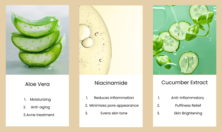 DM Water, Aloevera Extract, Niacinamide, Kojic Acid, Cucumber Extract, Glycerin, Collagen, Peptide, Tranexamic Acid, Carbopol, Triethanolamine DM DM, Betaine Anhydrous, Fragrance, Sodium Hyaluronate, Glycolic Acid